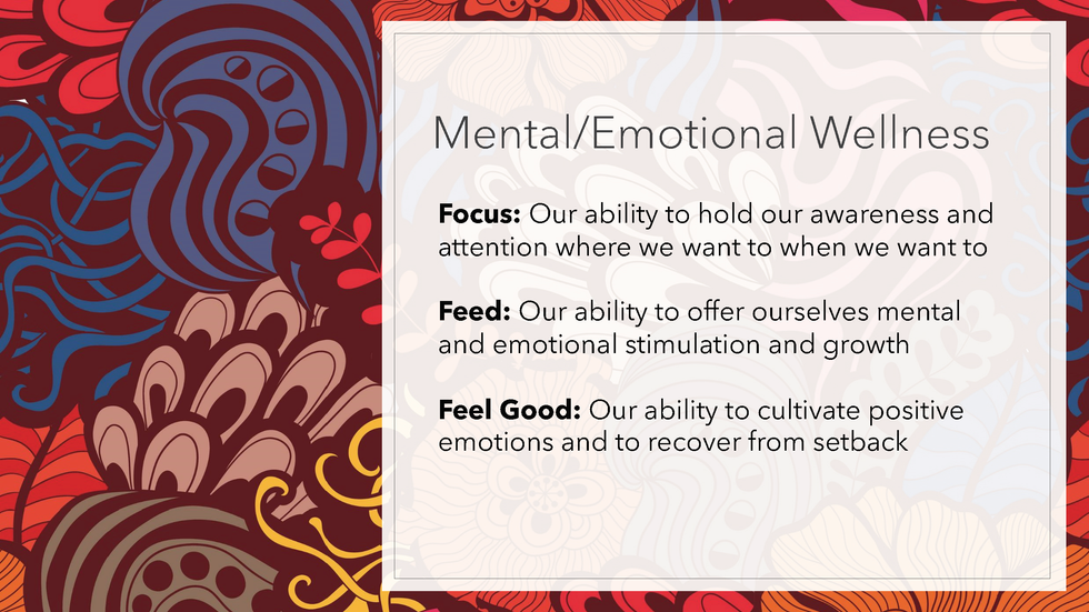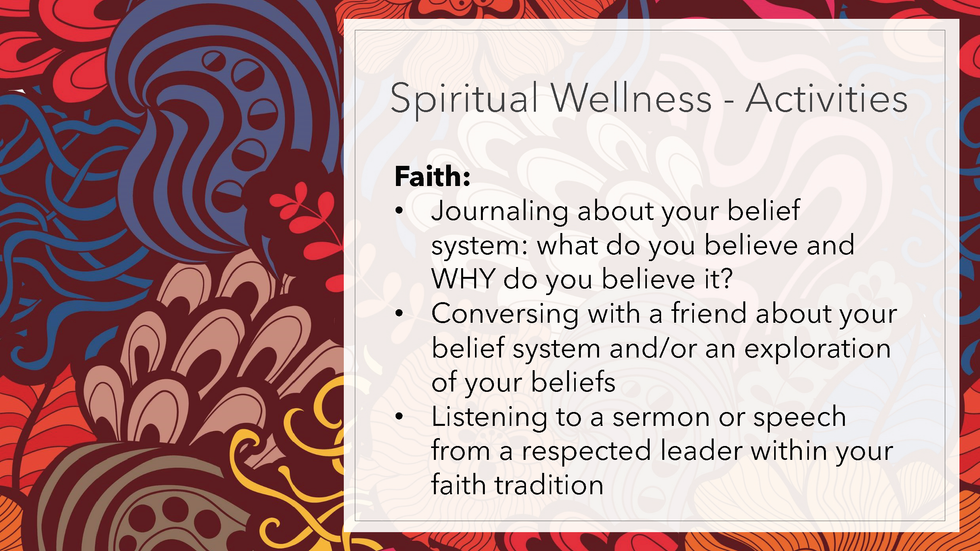 I recommend that you watch the four wellness realm videos below and review the slides which provide actionable steps toward improving your physical, mental/emotional, social, and spiritual wellness.